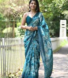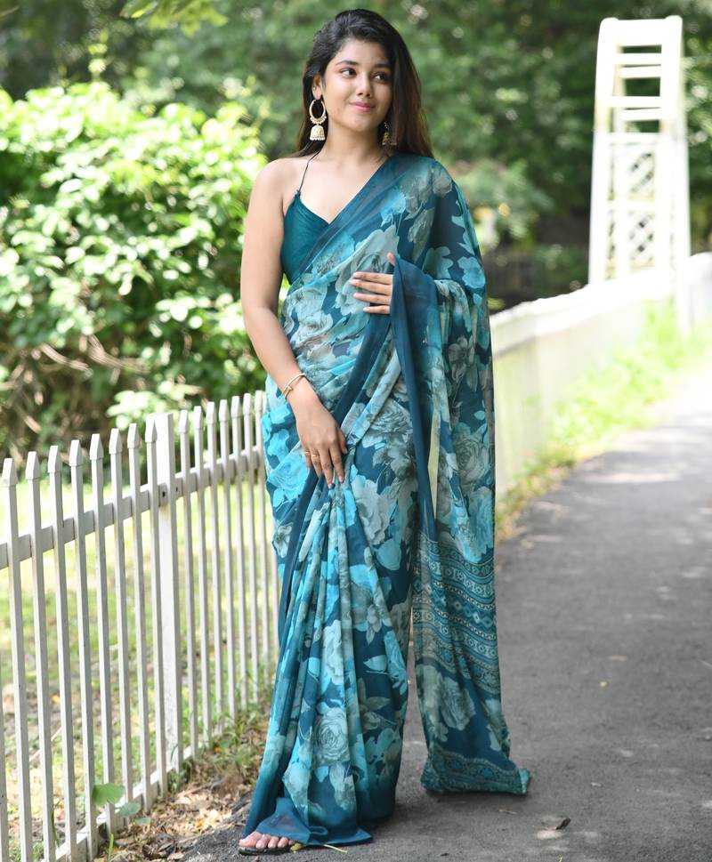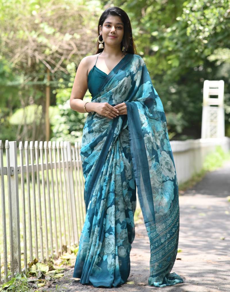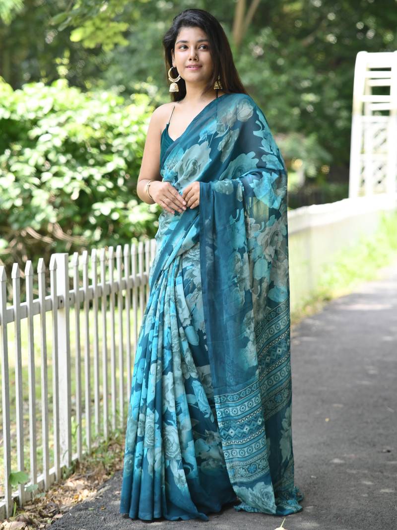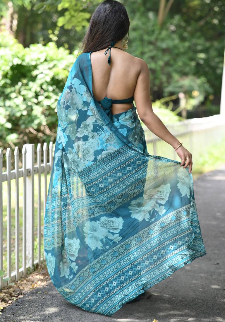 Turquoise floral print chiffon saree with unstiched blouse piece
