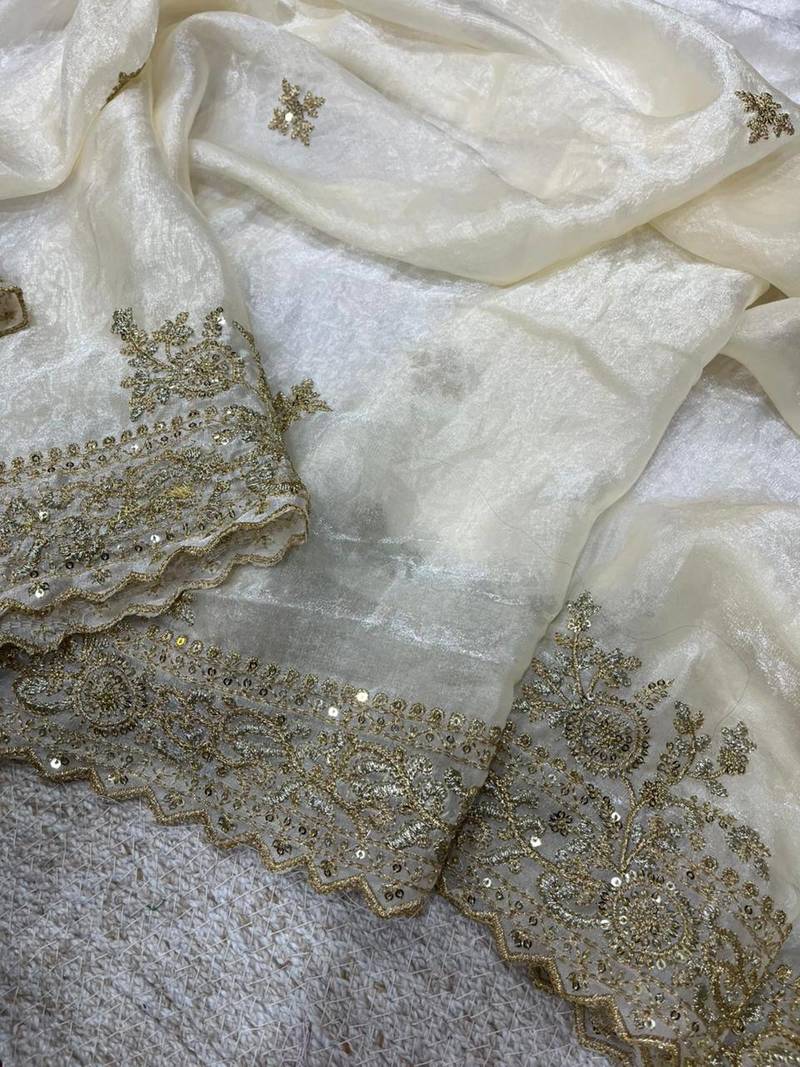 | Product Description | This Unstitched White Satin Saree With A Designer Border Showcases A Luxurious Smooth Drape That’s Ideal For Ceremonial Occasions. The Fabric Reflects Light Beautifully, Giving An Elegant Sheen That Enhances The Rich Embroidered Details Along The Border And Fancy Pallu. Paired With A Striking Maroon Satin Blouse Piece Featuring Intricate Hand Embroidery, This Set Perfectly Balances Bold Contrast And Timeless Sophistication. Its Premium Satin Composition And Detailed Handiwork Make It Perfect For Weddings, Festive Functions, Or Special Celebrations. Customize The Stitching To Your Measurements And Style For A Tailor Made Ethnic Look That Stands Out. |