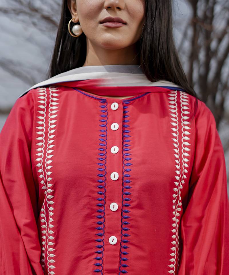 | Product Description | The Outfit Is A Traditional Red Kurta Paired With Matching Straight Pants And A White Dupatta. The Kurta Features Elegant White Embroidery Along The Front And Neckline, Adding A Touch Of Sophistication To The Simple Yet Vibrant Ensemble. The White Dupatta Complements The Embroidery And Adds A Soft Contrast To The Bright Red, Creating A Balanced And Graceful Look Suitable For Casual Or Semi Formal Occasions.