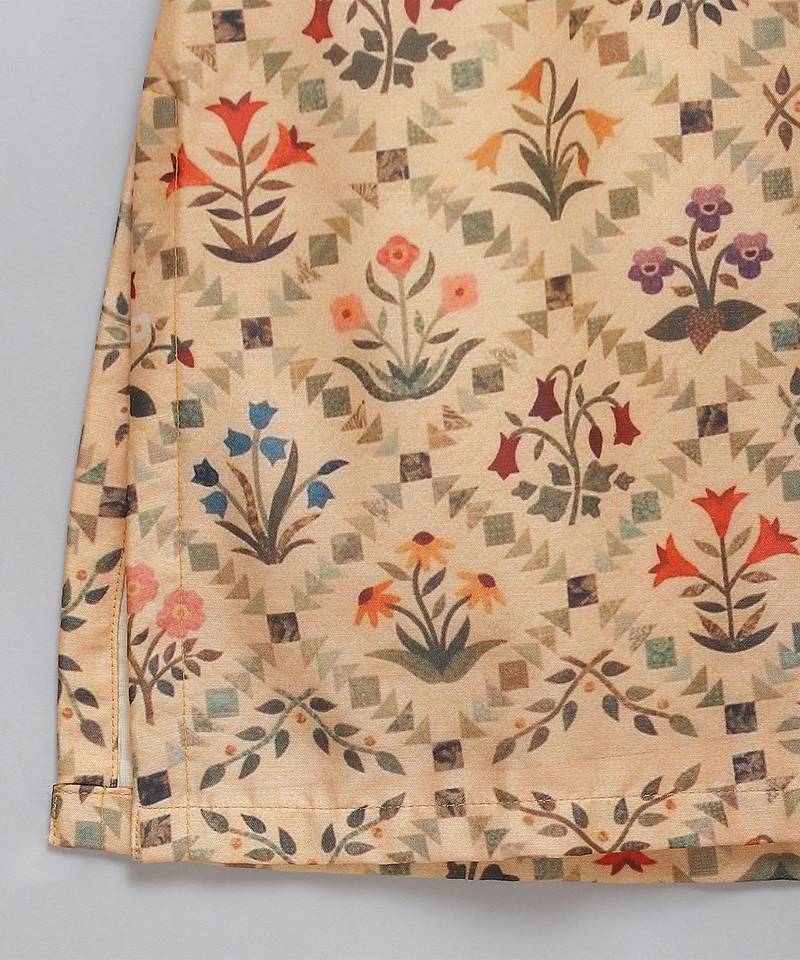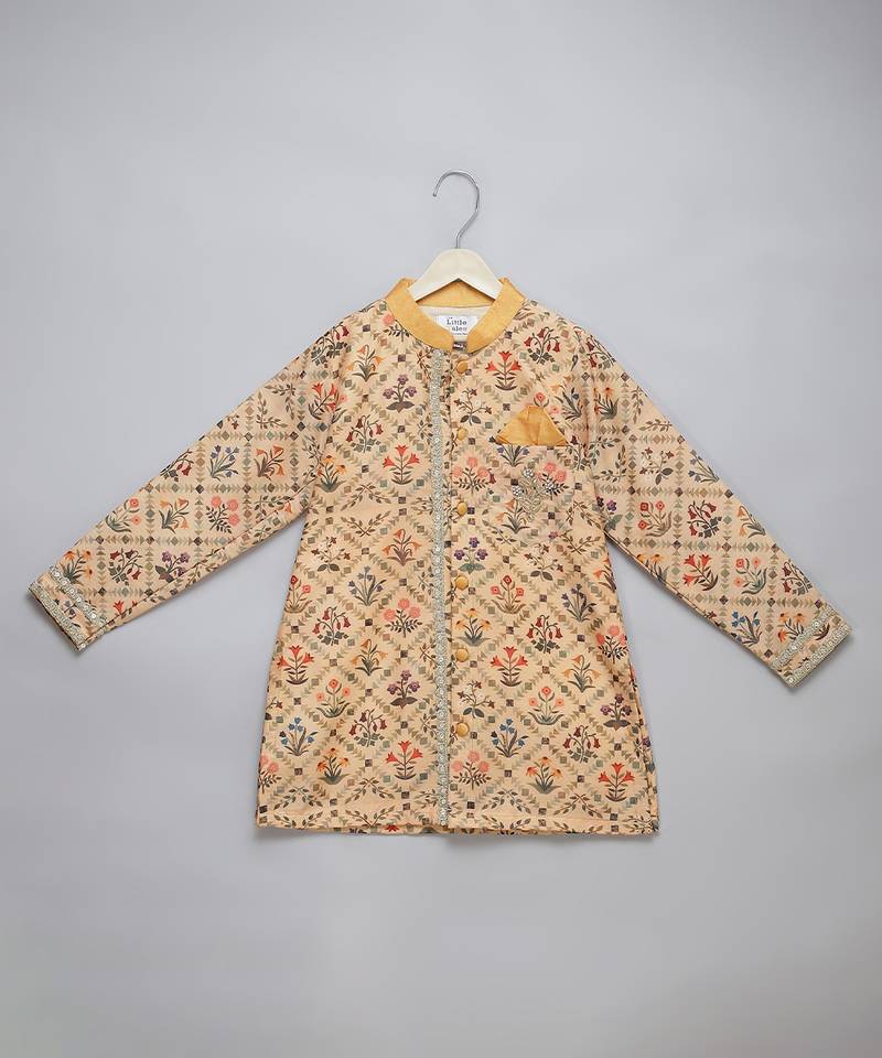 | Product Description | Golden Mughal Printed Front Open Kurta Set With Embroidery On The Pocket. Bottom With Elastic.