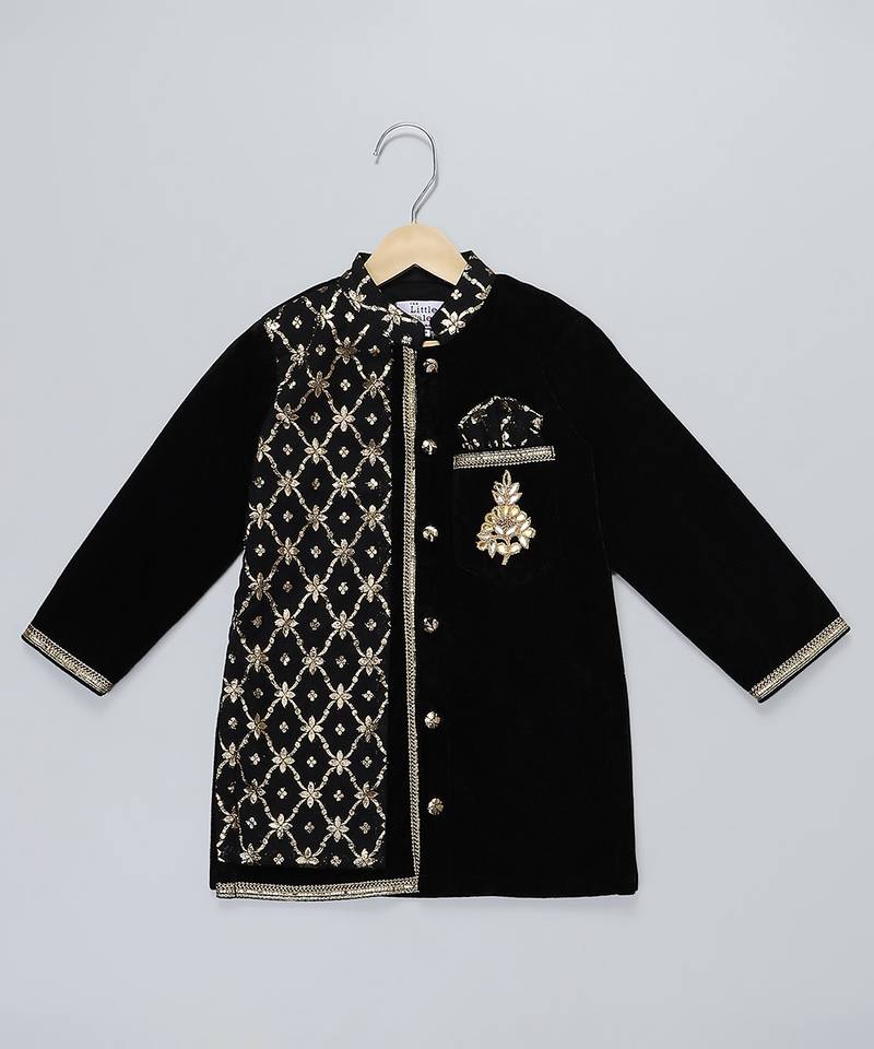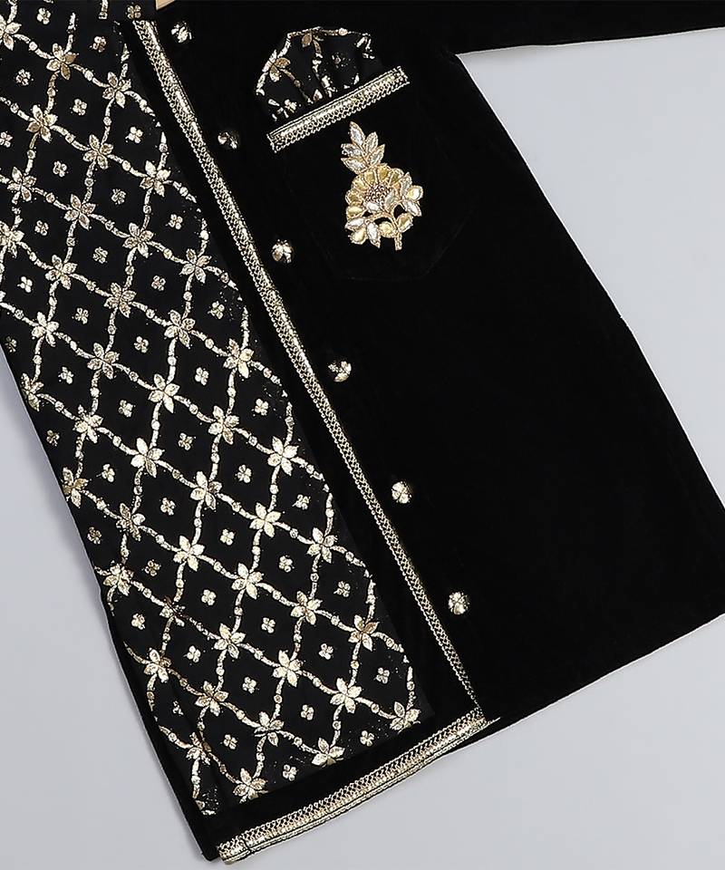 | Product Description | Black Velvet Kurta With Attached Zari Panel On One Side. Kurta With Embroidered Patch On Pocket With Chanderi Pocket Square.Kurta With Cotton Lining.Kurta With Front Opening .Kurta With Fabric Buttons. Black Cotton Silk Trousers . Bottom With Belt And Elasticated Waist At The Back.