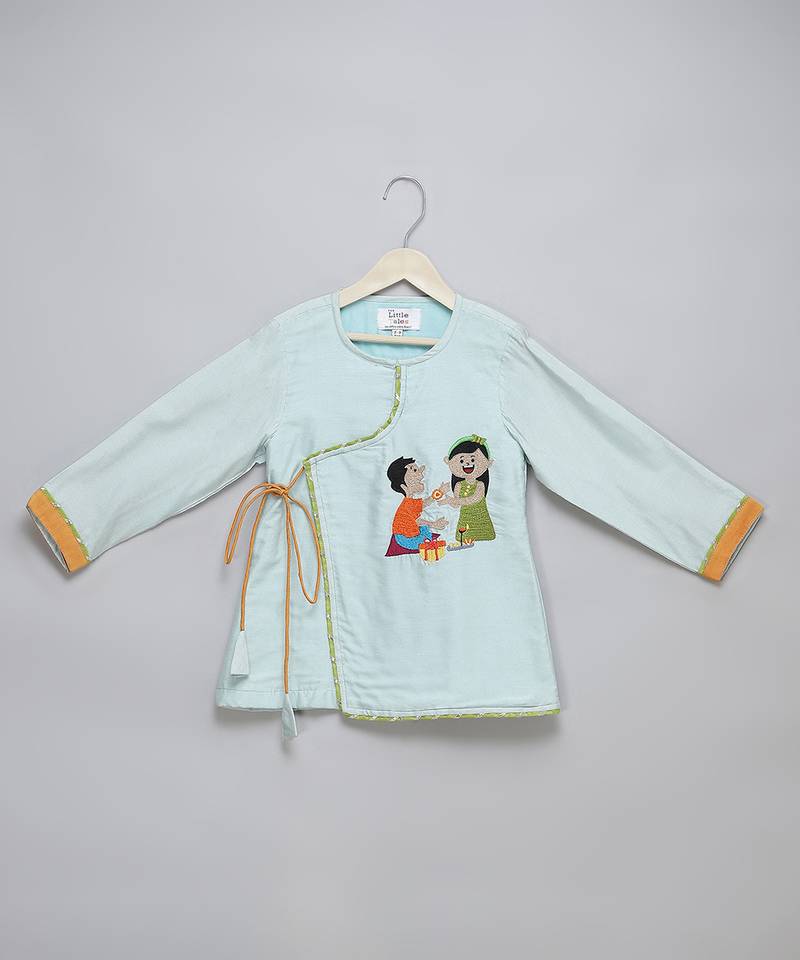 | Product Description | Blue Kids Embroidery Kurta With Tie Ups On The Side . Kurta With Lace Finishings . Orange Dhoti With Pleating And Contrast Lace Finishings. Bottom With Elasticated Waist