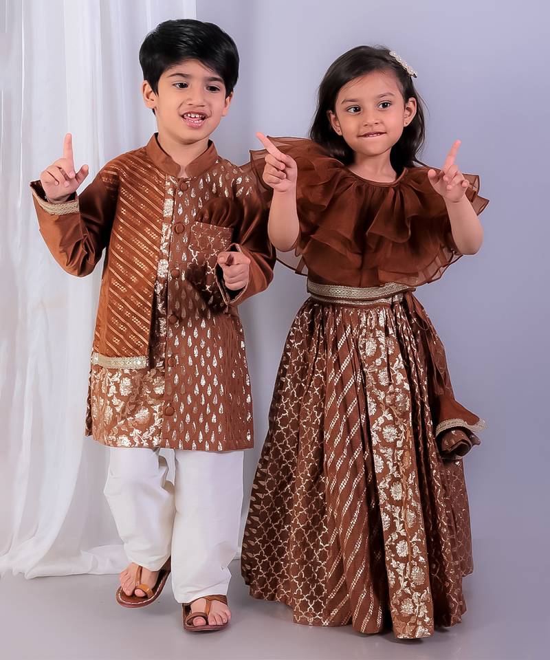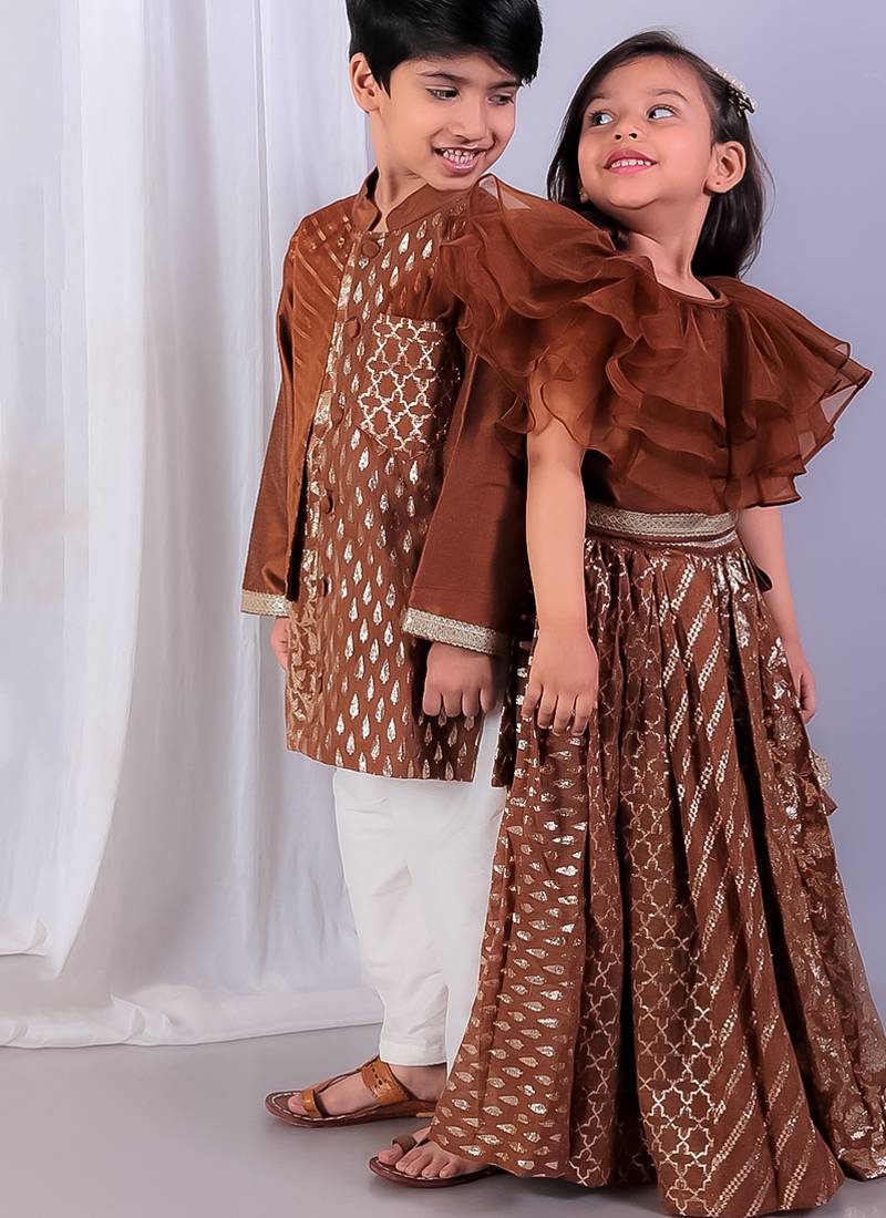 | Product Description | Brown Chanderi Kurta With Cotton Lining.Kurta With Front Opening. Attached Cotton Zari Panels On The Kurta . Pocket With Pocket Square.Pyjama With Elastic.