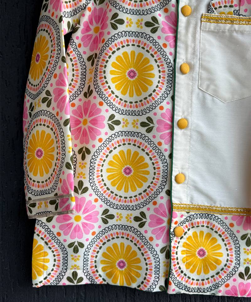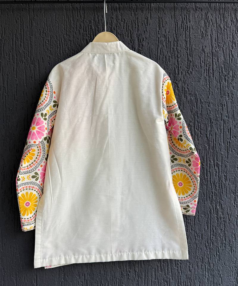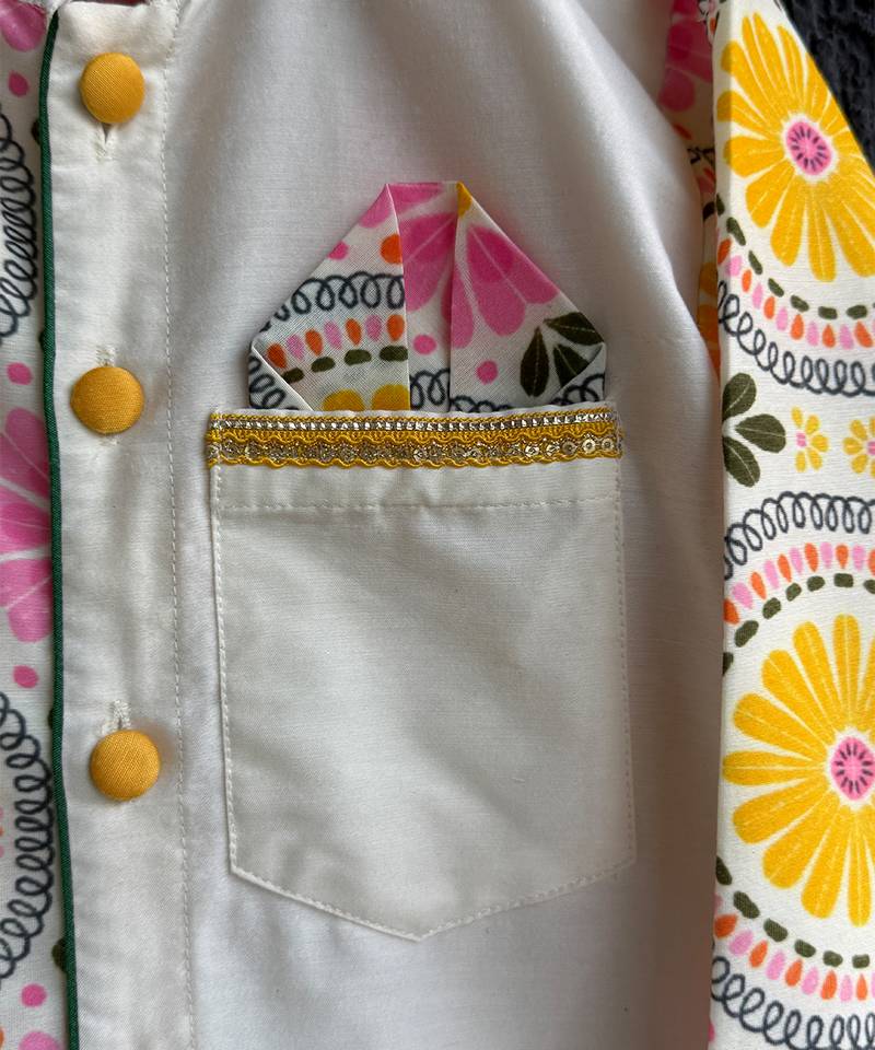 | Product Description | Off White Sunflower Print Kurta With Fornt Opning Kurta With Pocket In Pocket Squer Kurta With Full Sleeves.Kurta With Inside Cotton Lining Bottom With Elasicated Waist . Botton Off Pyjama