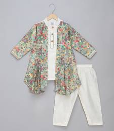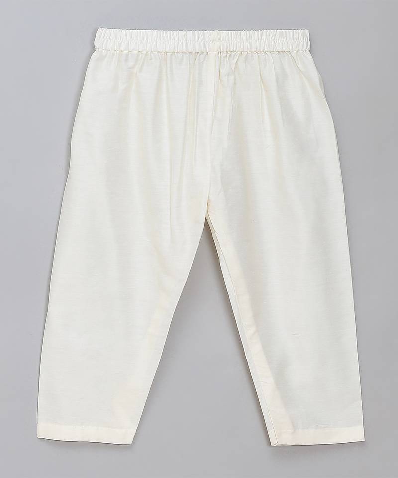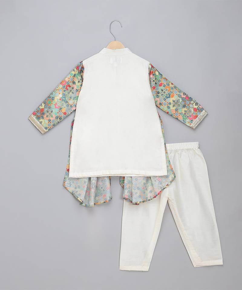 | Product Description | Off White Cotton Silk Kurta With Front Opening . Attached Kaliedoscope Pleated Printed Panels On Both The Sides Of The Kurta .Fabric Buttons. Pajama With Elastic