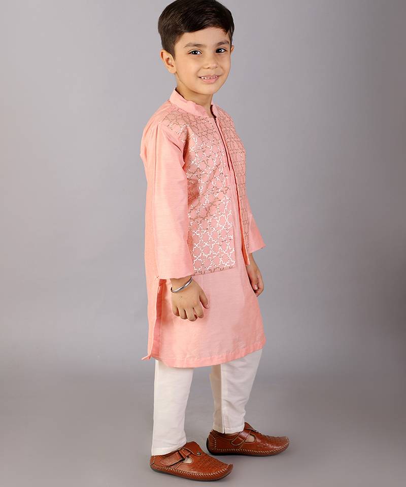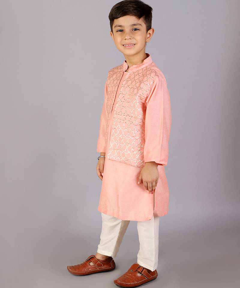 | Product Description | Pastel Peach Kurta With Zari Attached Jacket On Both Sides. Kurta With Front Opening .Offwhite Cotton Silk Pyjama . Bottom With Elasticated Waist