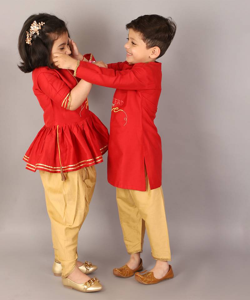 | Product Description | Red Sibling Love Embroidred Kurta With Full Sleeves. Kurta With Side Slits.Bottom With Side Opening . Beige Bottom With Elasticated Waist And Lace Finishings .