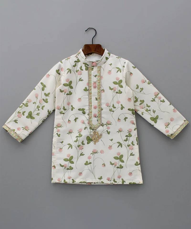 | Product Description | Peach Flowers Printed Kurta With Gota Lace Work At The Front And Sleeves Hem.Kurta With Gota Patch Adorned With Tiny Pearls At The Front.Kurta With Side Slits And Fabric Covered Decorative Buttons.Kurta With Hooks At The Front And A Mandarin Collar.Pyjama With An Elasticated Waist.