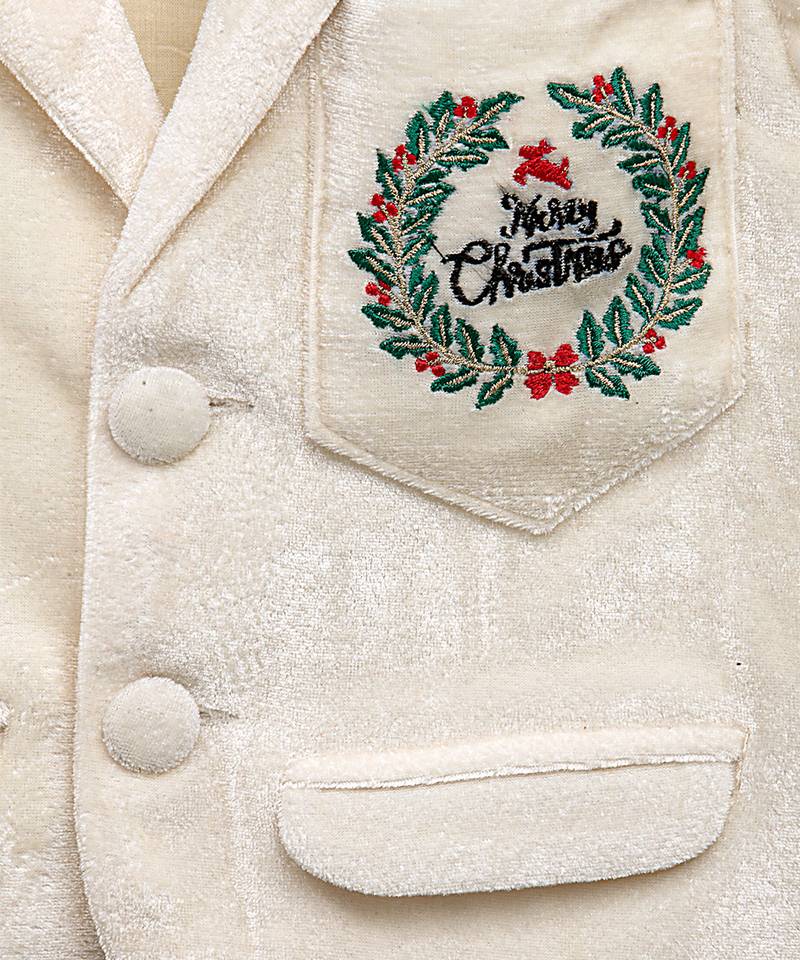 | Product Description | Off White Velvet Blazer Cotton Lining. Merry Christmas Embroidery On Pocket. .Green Pocket Square . Blazer In Full Sleeves. Blazer With 2 Front Button Opening