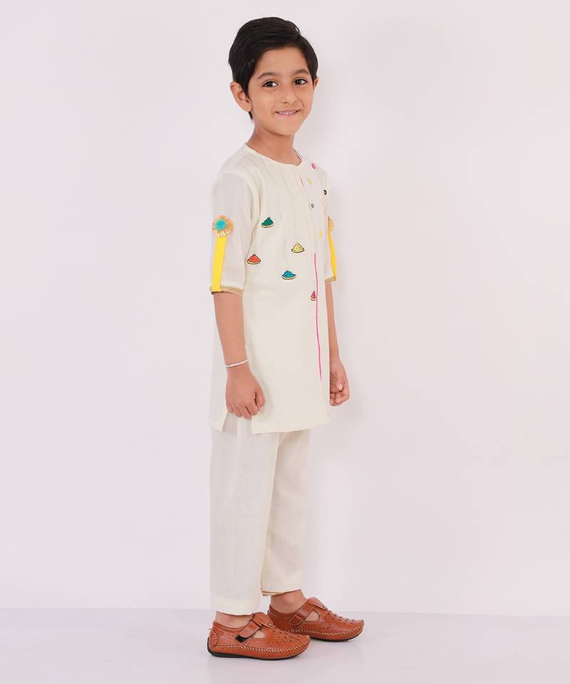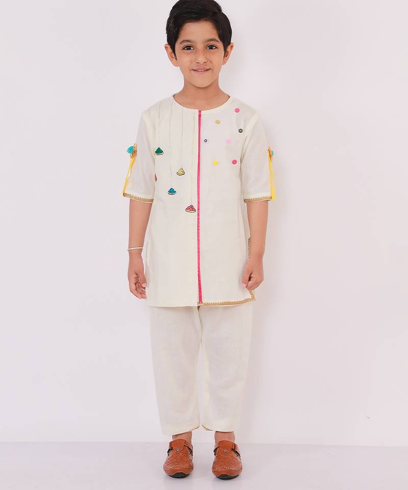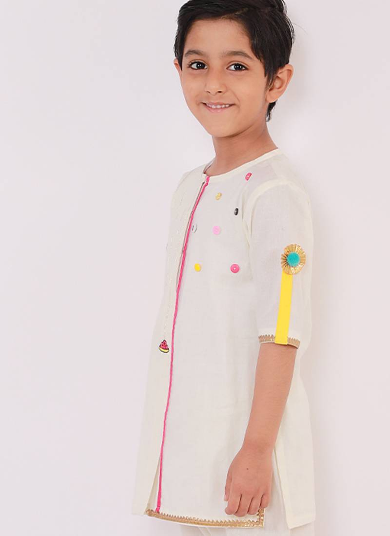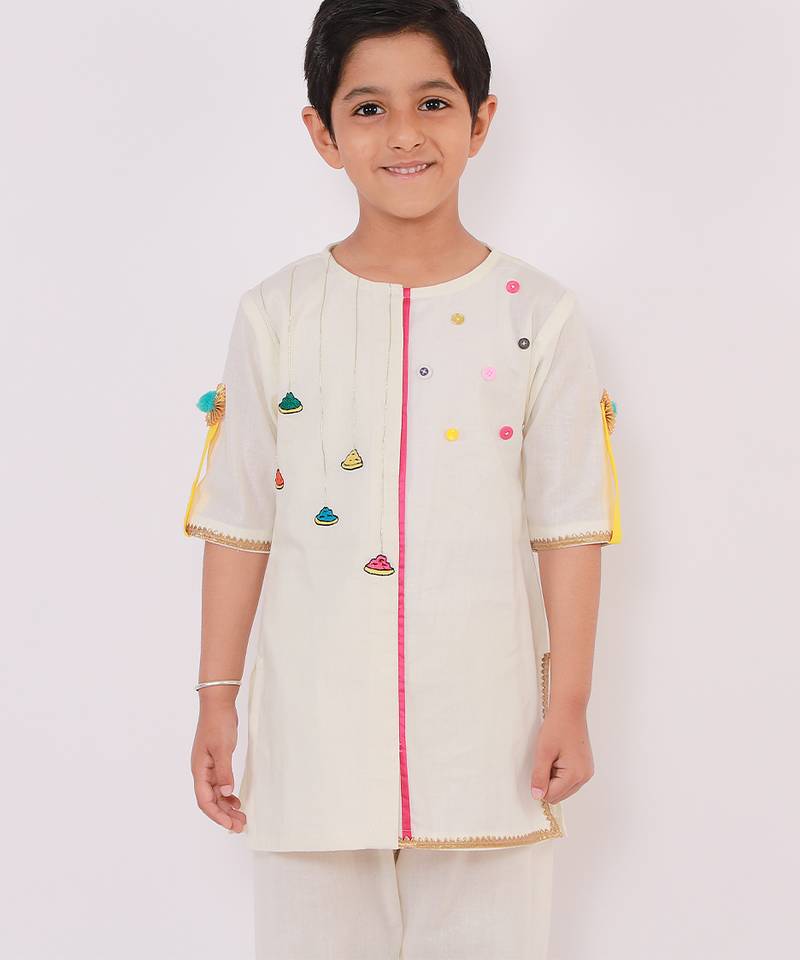 | Product Description | Off White Gulal Embroidered Holi Kurta With Full Sleeves. Kurta With A Line Cut.Kurta With Colorful Buttons Finishings.. Pyjama With Elasticated Waist.
