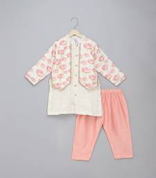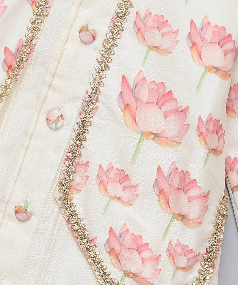 | Product Description | Off White Cotton Jaquard Kurta With Lotus Printed Attached Jacket On Topon Both Sides And Back . Frontopening . Pajama With Elastic.