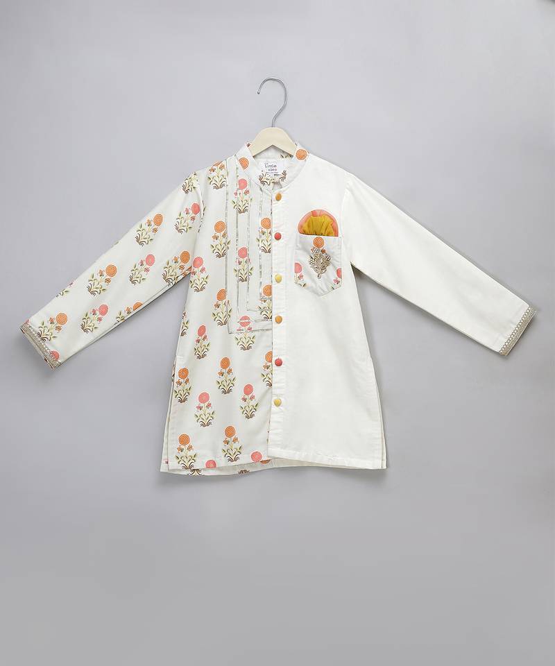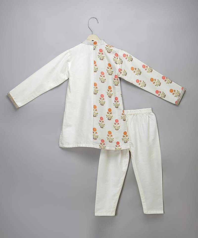 | Product Description | Off White Kurta With Printed Oanel On Sides . Front Open Kurta. Pocket Has And Embrdoiered Boota Over The Same. Bottom With Elastic.