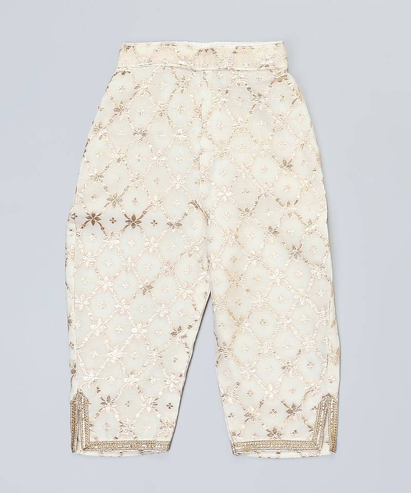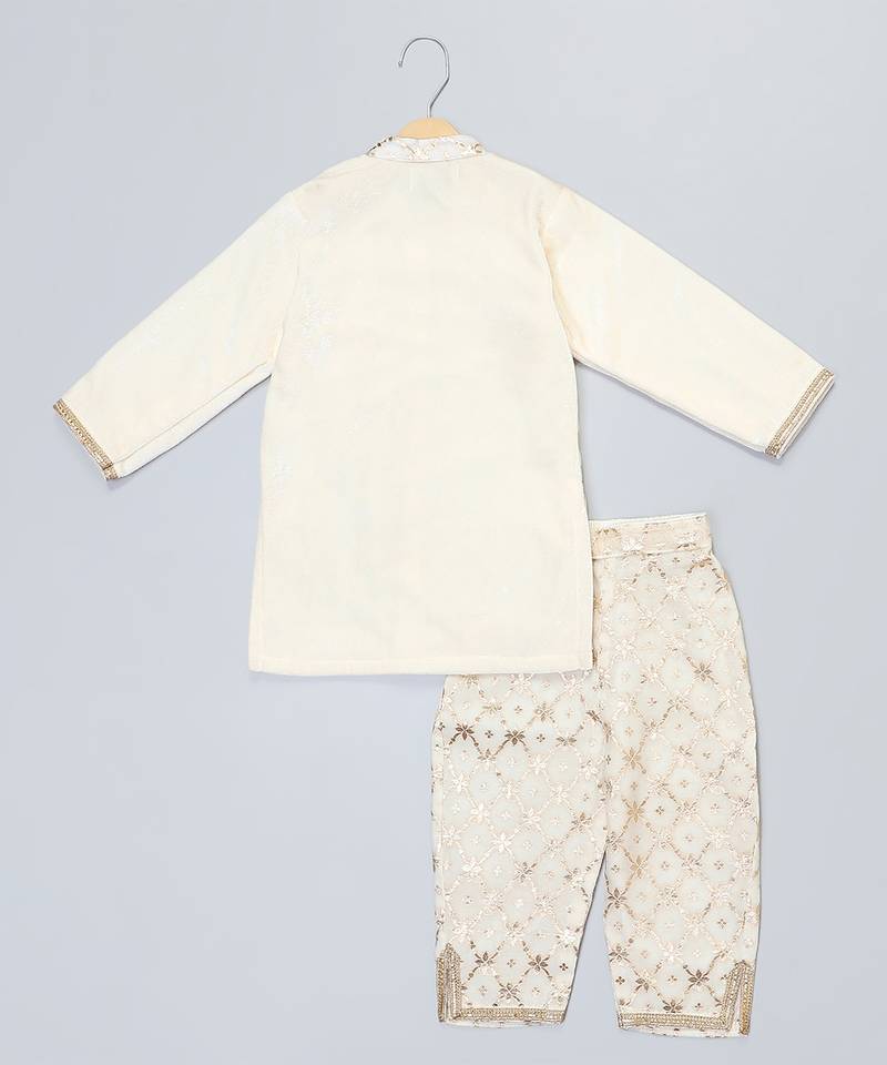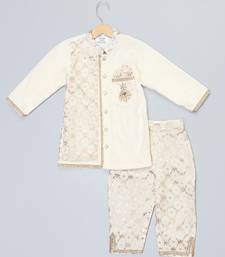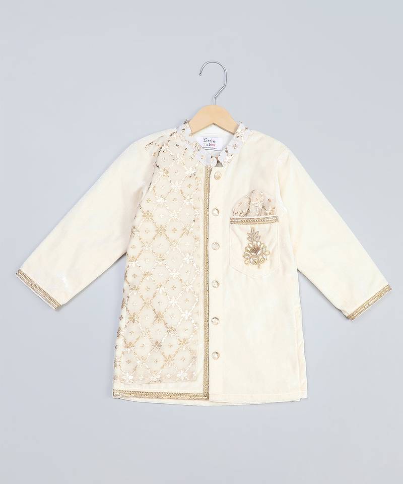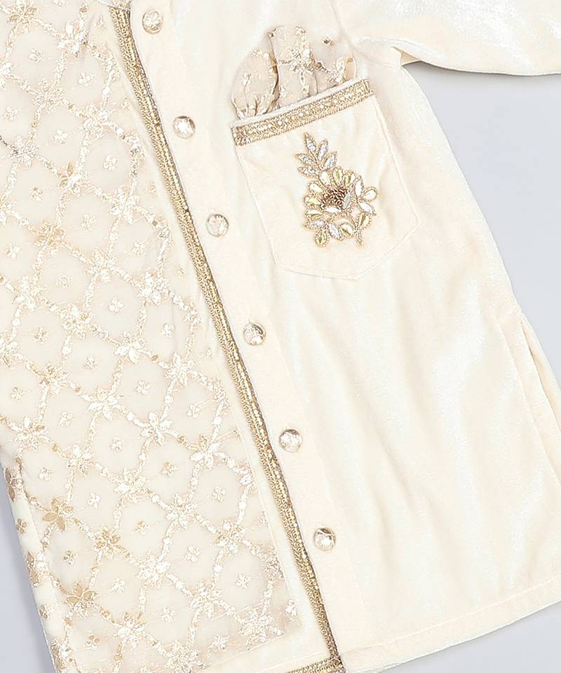 | Product Description | Off White Velvet Kurta With Attached Zari Panel On One Side. Kurta With Embroidered Patch On Pocket With Chanderi Pocket Square.Kurta With Cotton Lining.Kurta With Front Opening .Kurta With Fabric Buttons. Off White Cotton Silk Trousers . Bottom With Belt And Elasticated Waist At The Back.