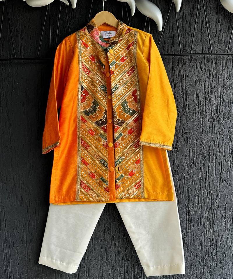 | Product Description | Orange And Yellow Concoction Kurta With Embroiered Panel On The Centre Front Accentuated With Lace .Kurta With Front Opening Enhanced With Fabric Buttons .Bottom With Elasticated Waist
