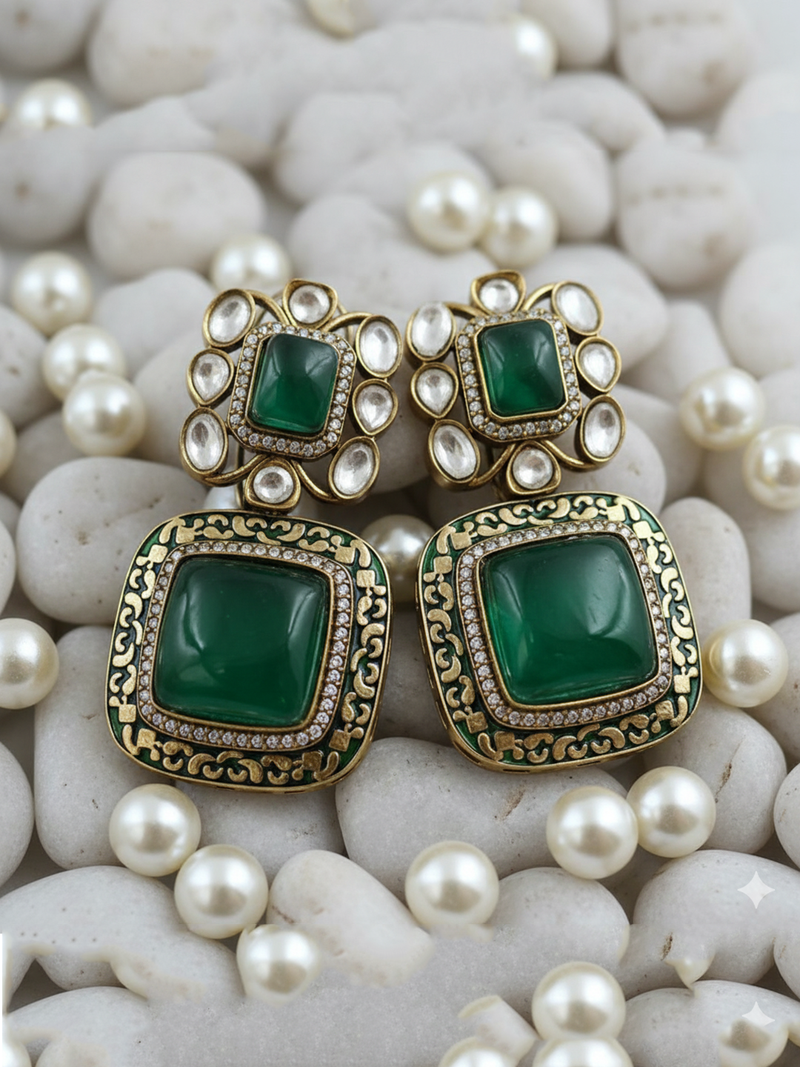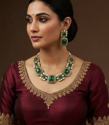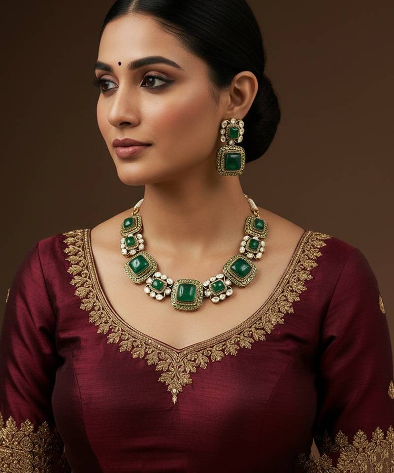 | Product Description | This Elegant Antique Gold Plated Choker Necklace Set Is Designed With Rich Green Square Stones And Detailed Filigree Work, Giving It A Classic Royal Charm. Each Green Stone Is Highlighted With Intricate Antique Gold Borders And Surrounded By Lustrous Pearl Clusters, Making The Design Both Traditional And Timeless. The Matching Earrings Complete The Set Beautifully, Adding A Graceful Touch To Your Festive And Ethnic Outfits.Perfect For Weddings, Traditional Functions, Parties, And Festive Celebrations, This Necklace Set Pairs Wonderfully With Sarees, Lehengas, Silk Outfits, And Indo Western Styles. |