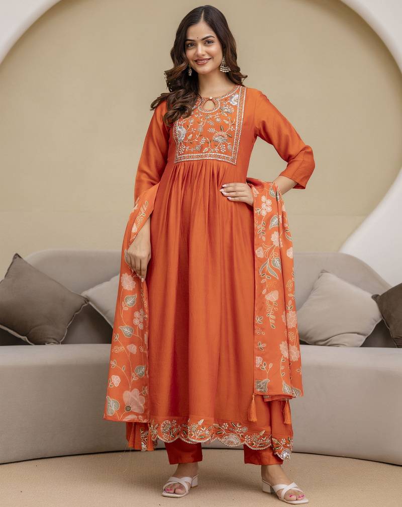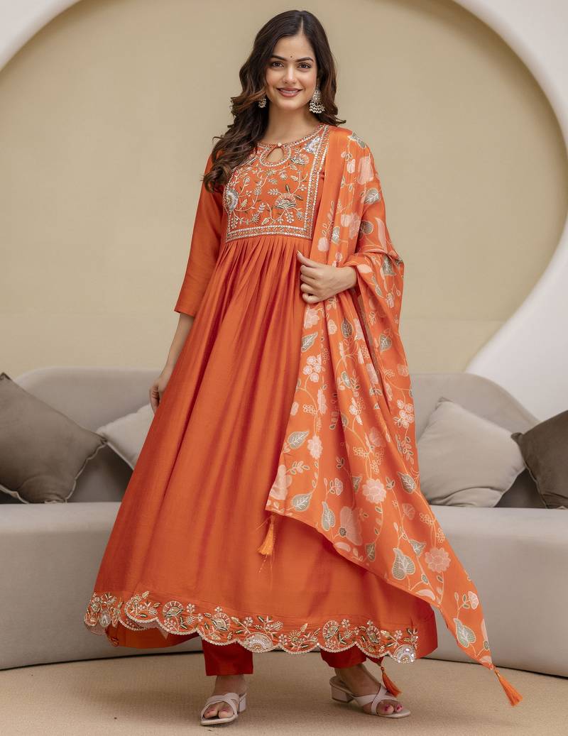Product Name Orange Art Silk Hand Work Embroidery Anarkali Kurta Pant With Dupatta