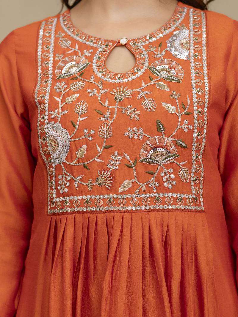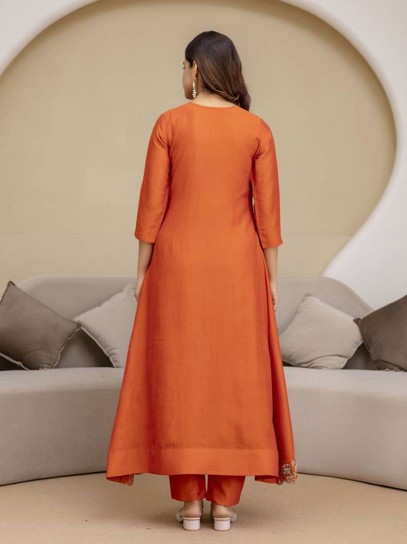 Orange art silk hand work embroidery anarkali kurta pant with dupatta stitched
