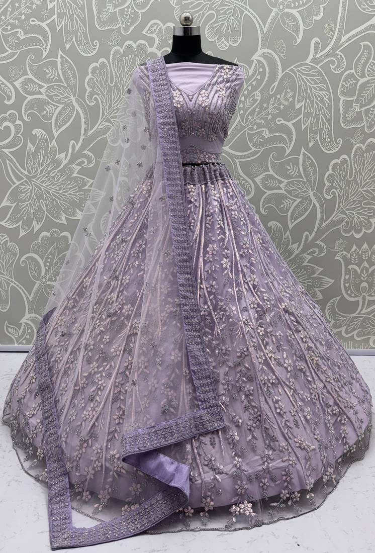 The Purple Lehenga Features Luxurious Net Fabric Adorned With Fancy Embroidery That Blends Dori Work, Sequins, And Zircon Diamond Accents. Its Rich Floral And Vine Patterns Create A Sparkling, High End Partywear Look With Full Cancan And Canvas Stitching For A Grand Flair.