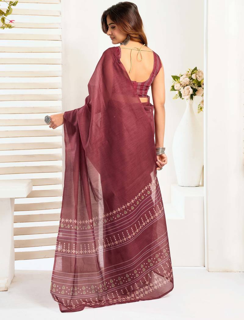 | Product Description | • Elegant Maroon Linen One Minute Saree Featuring Soft Printed Stripes And Geometric Motifs.
