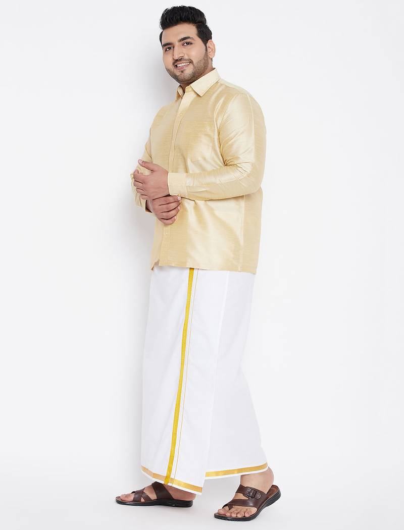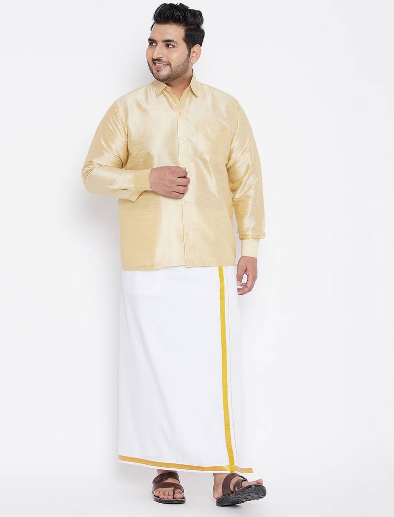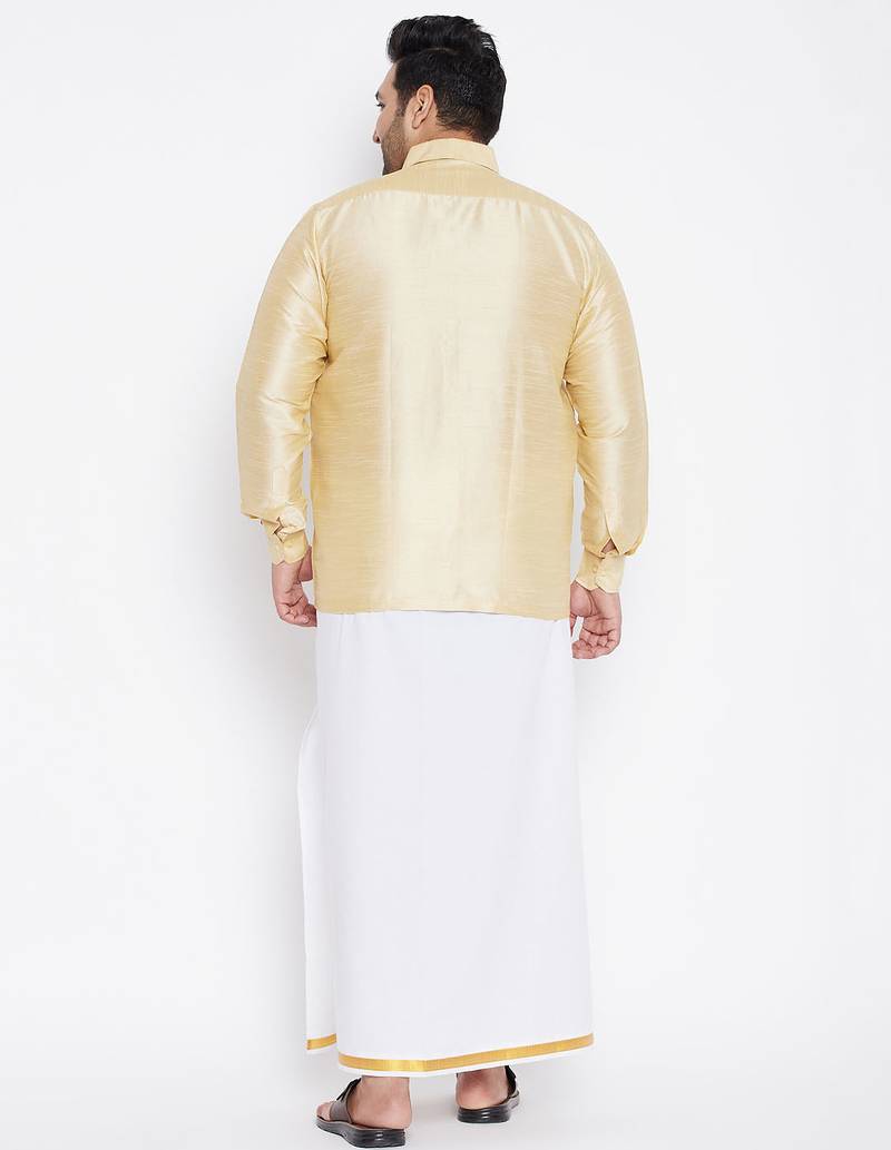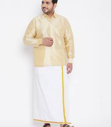 Product Name Men's Gold And White Silk Blend Shirt And Mundu Set