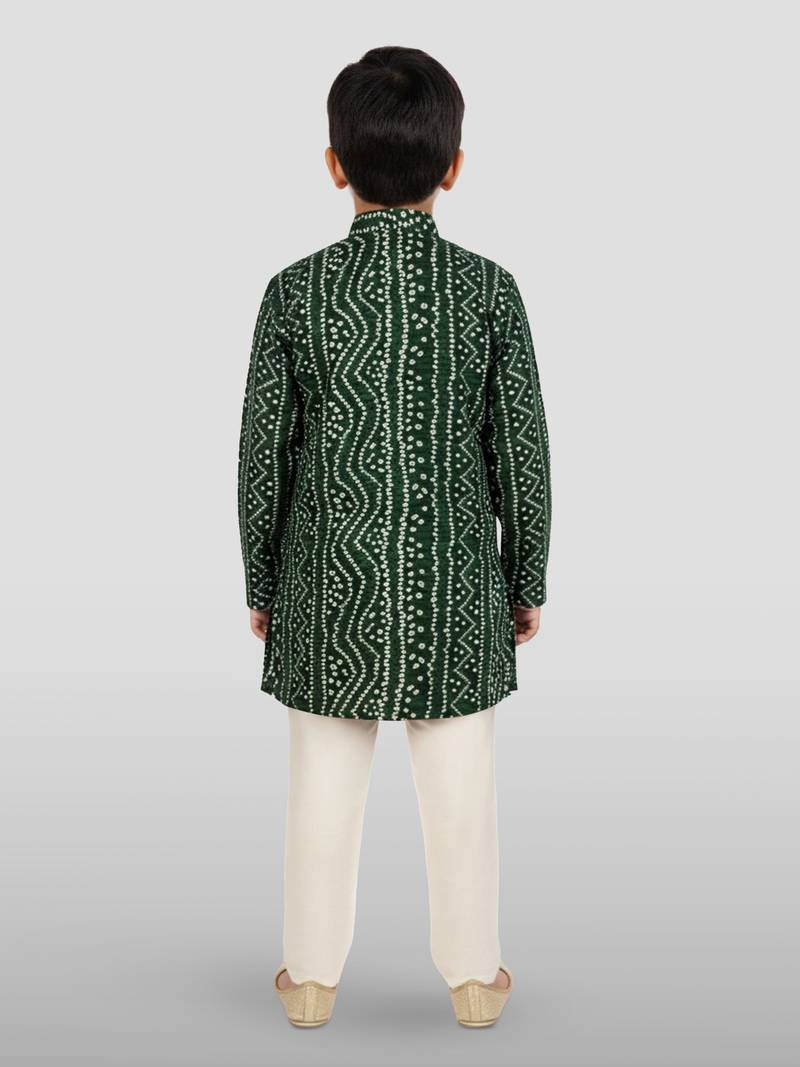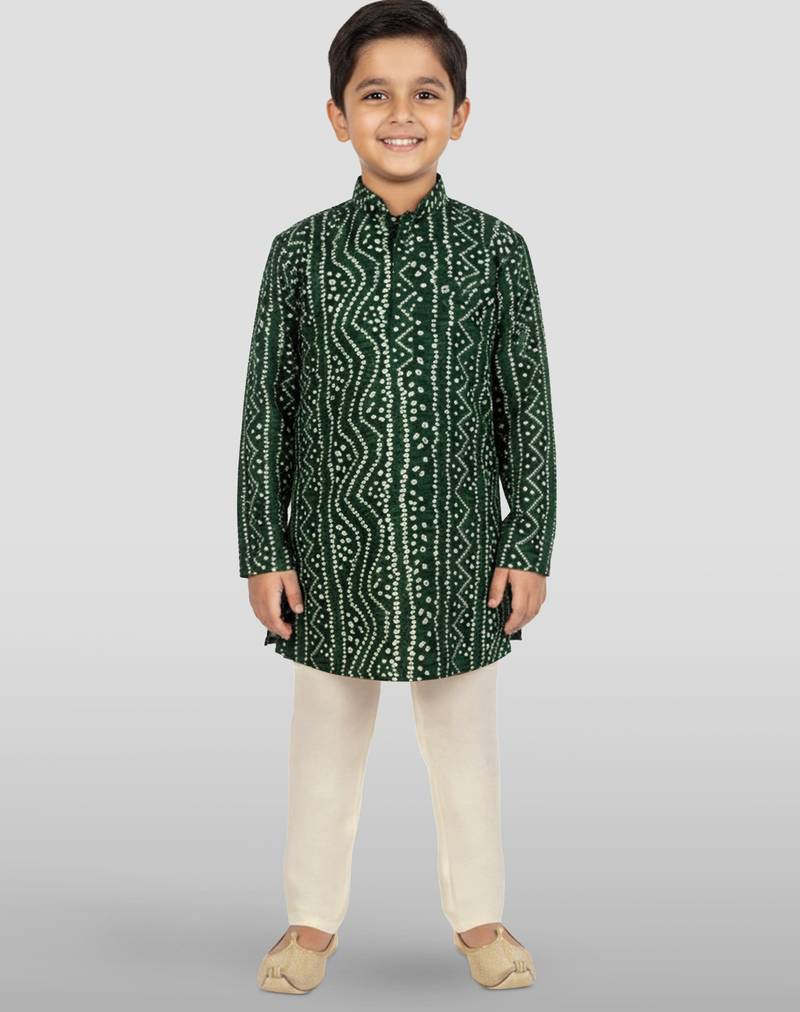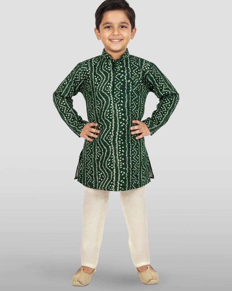 | Product Description | Celebrate Traditions With Vastramay's Green Rayon Bandhani Kurta Set. Showcases Beautiful Foil Bandhani Digital Print With Authentic Patterns. Includes Contrasting Cream Silk Blend Pyjama For Stylish Ethnic Sophistication. |