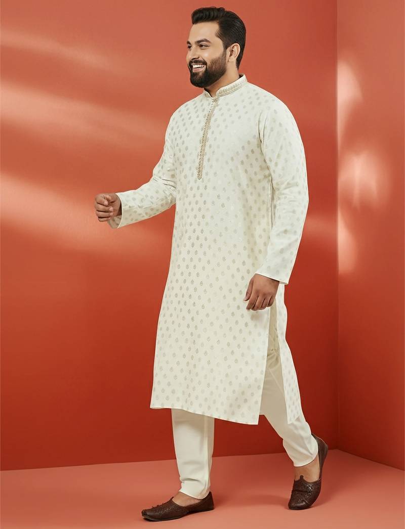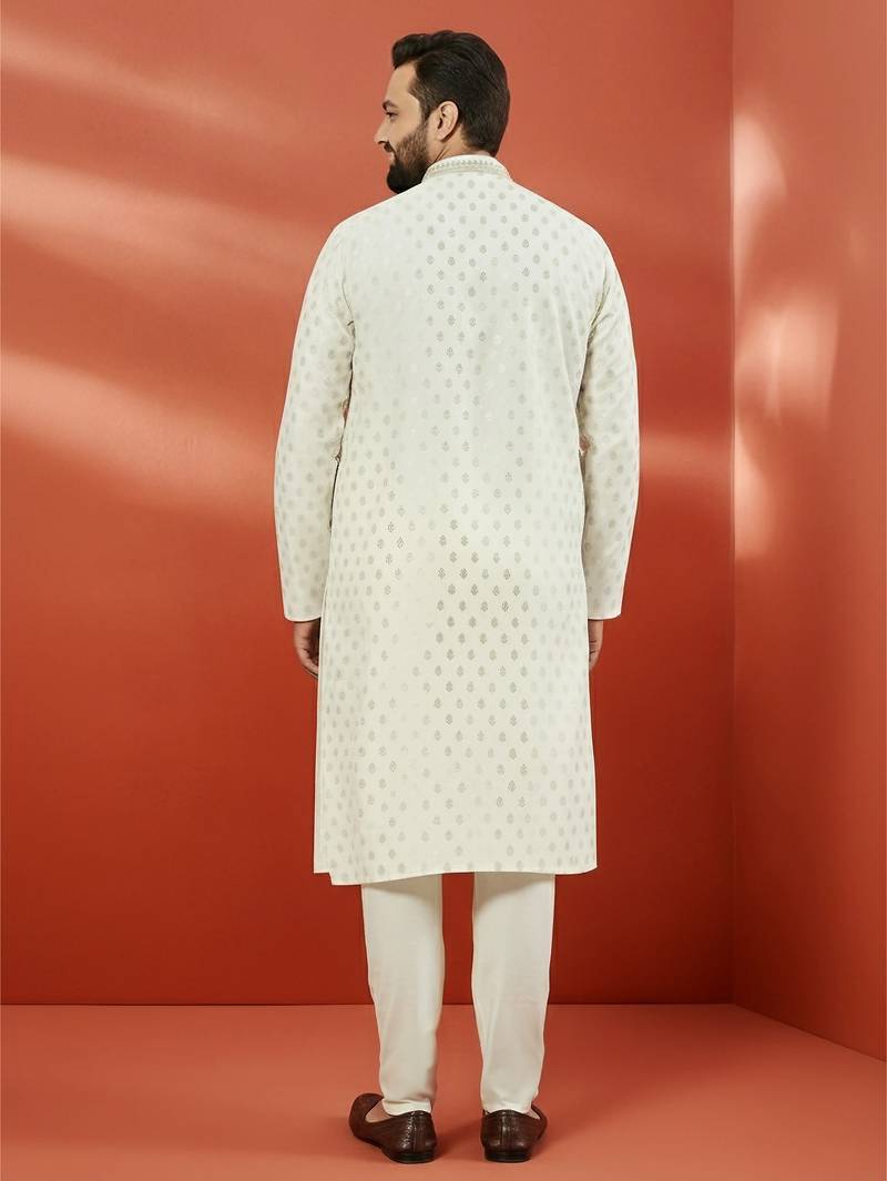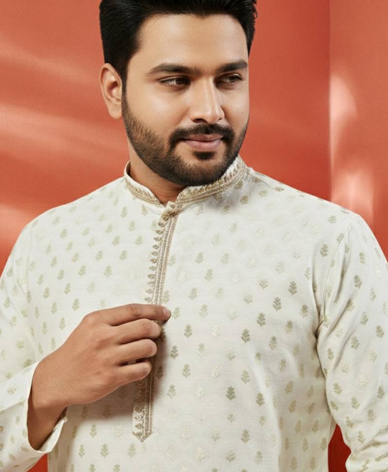 Product Name | Men's Cream Silk Jacquard Kurta With Pyjama Premium Wedding Set | |