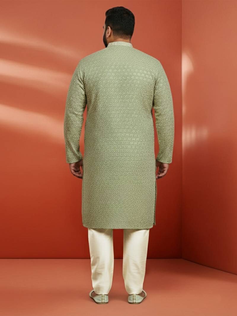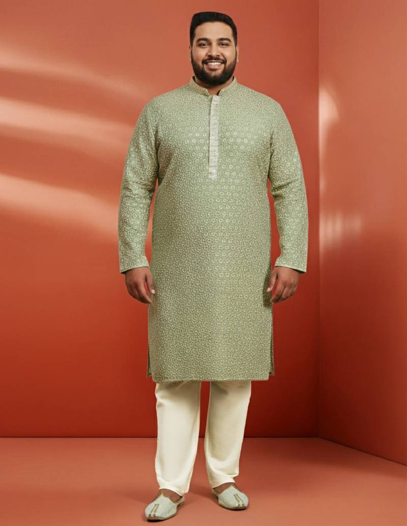 Product Name | Men's Pista Green Sequin Kurta With Cream Trousers Embroidered Festive Set | |