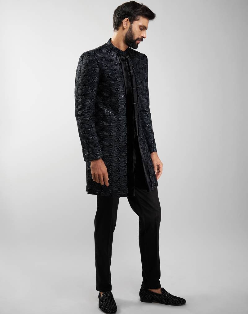 | Product Name | Men Velvet Embroidered Indo Western Kurta Set With Black Cotton Lycra Pant Wedding & Festive Wear | |
