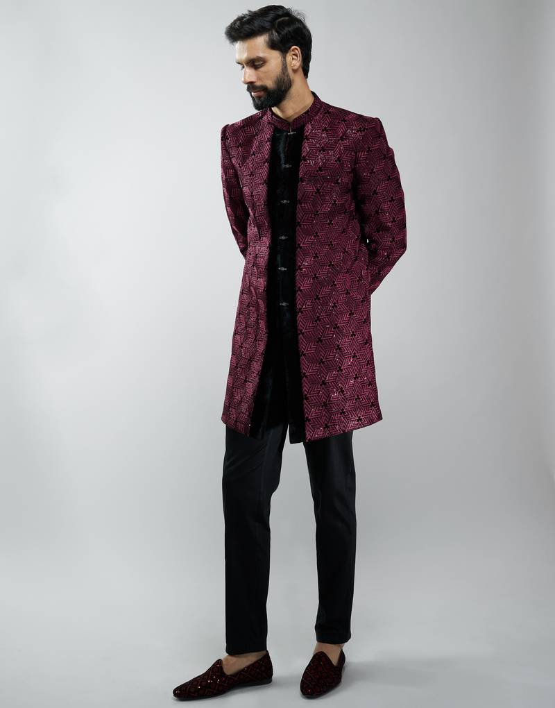 | Product Name | Men Wine Velvet Embroidered Indo Western Kurta Set With Black Cotton Lycra Pant Wedding & Festive Wear | |