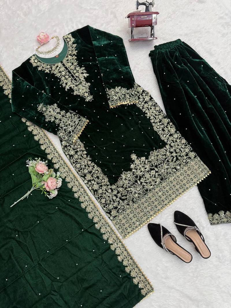 | Product Description | Traditional Velvet Designer Embroidery Work Wear Kurta Bottom Pair With Dupatta Fabric Details :
