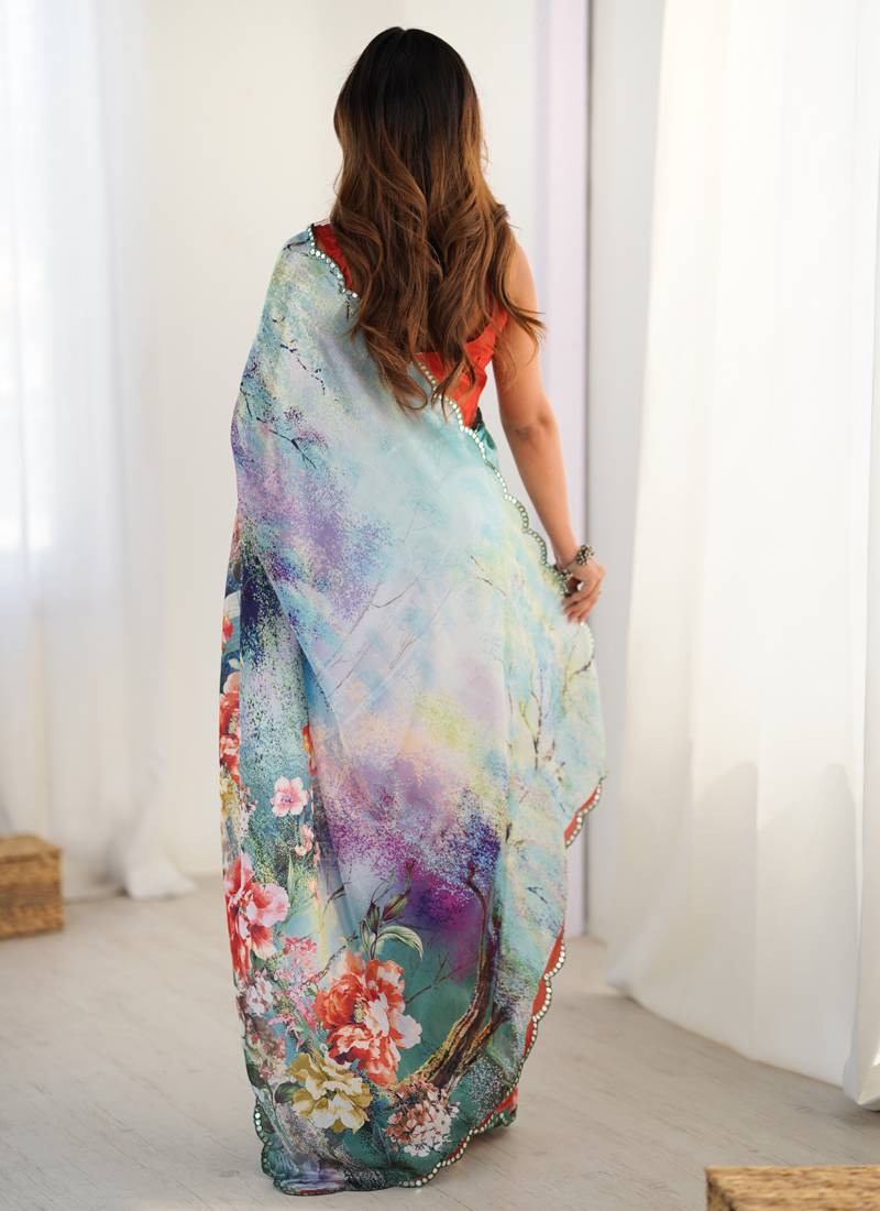 Multicolor chinon silk blend print work with mirror work border designer saree