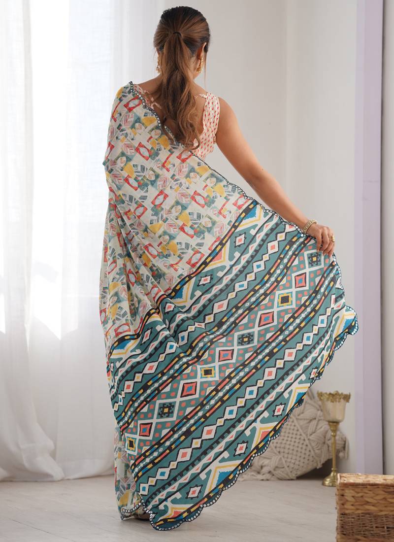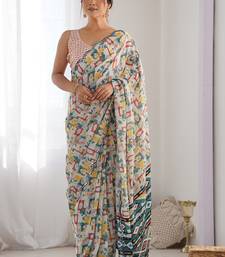 | Product Name | Off White Chinon Silk Blend Print Work With Mirror Work Border Designer Saree | |