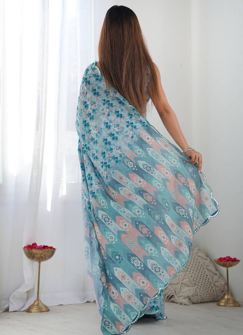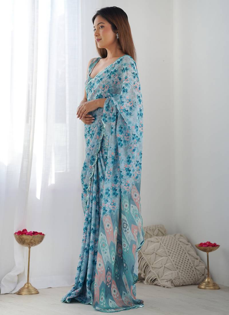 Sky blue chinon silk blend print work with mirror work border designer saree
