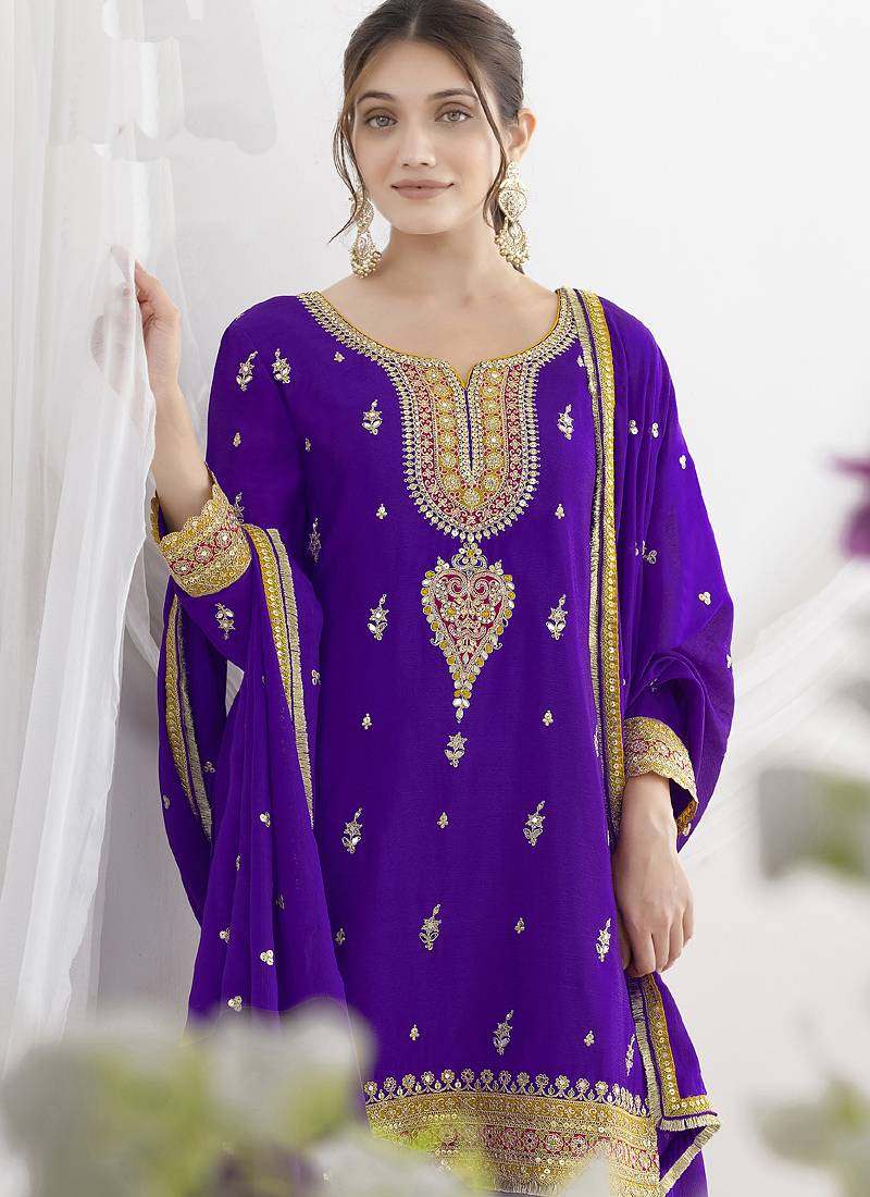 Violet chinon silk embroidered palazzo salwar suit stitched