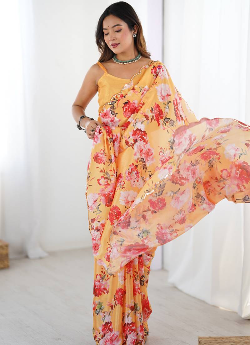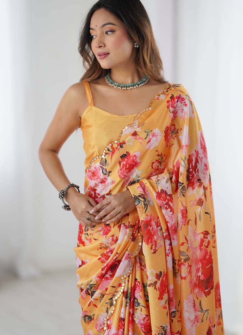 | Product Name | Yellow Silk Blend Print Work With Mirror Work Border Designer Saree | |