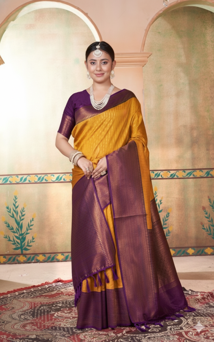 Yellow kanjivaram silk blend zari weaving with gold zari border and pallu saree with blouse for women