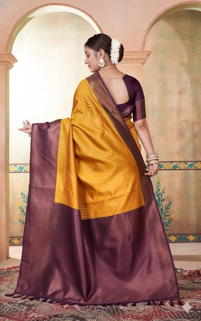 | Product Name | Yellow Kanjivaram Silk Blend Zari Weaving With Gold Zari Border And Pallu Saree With Blouse For Women | |