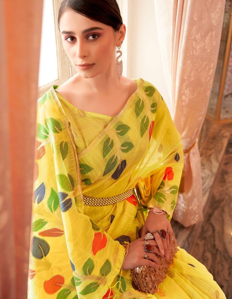 Yellow plain cotton cotton-sarees saree with blouse