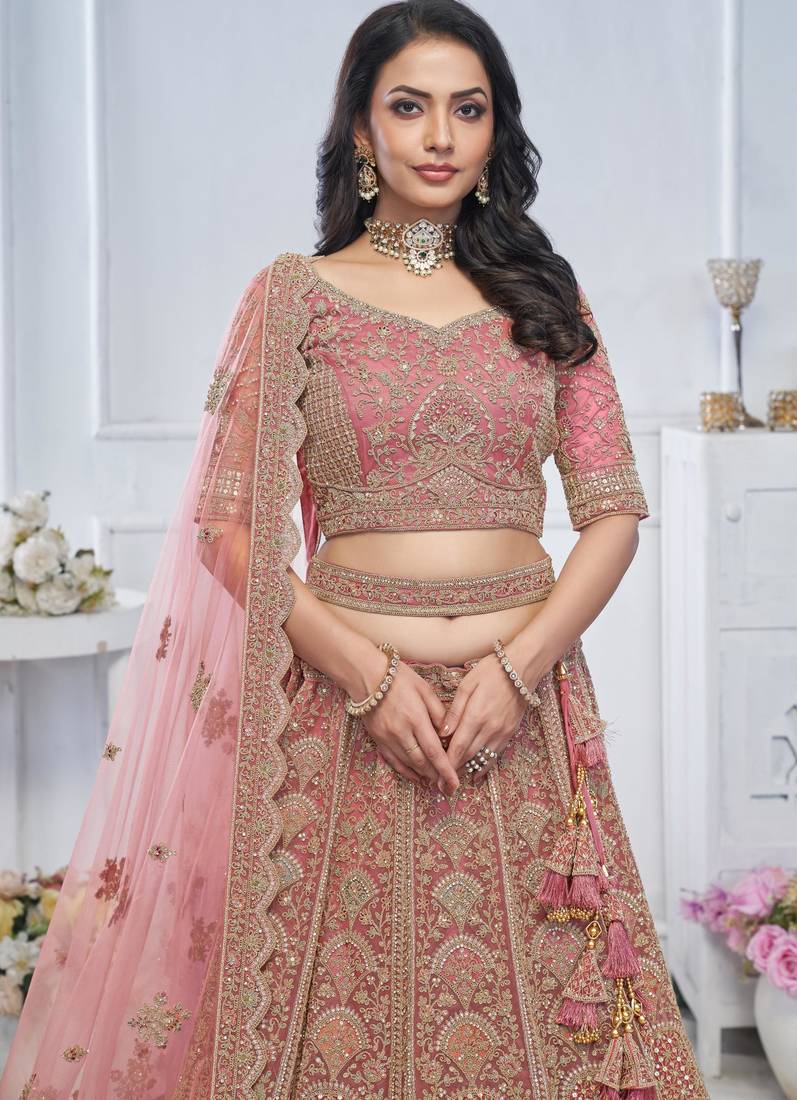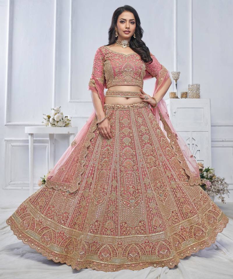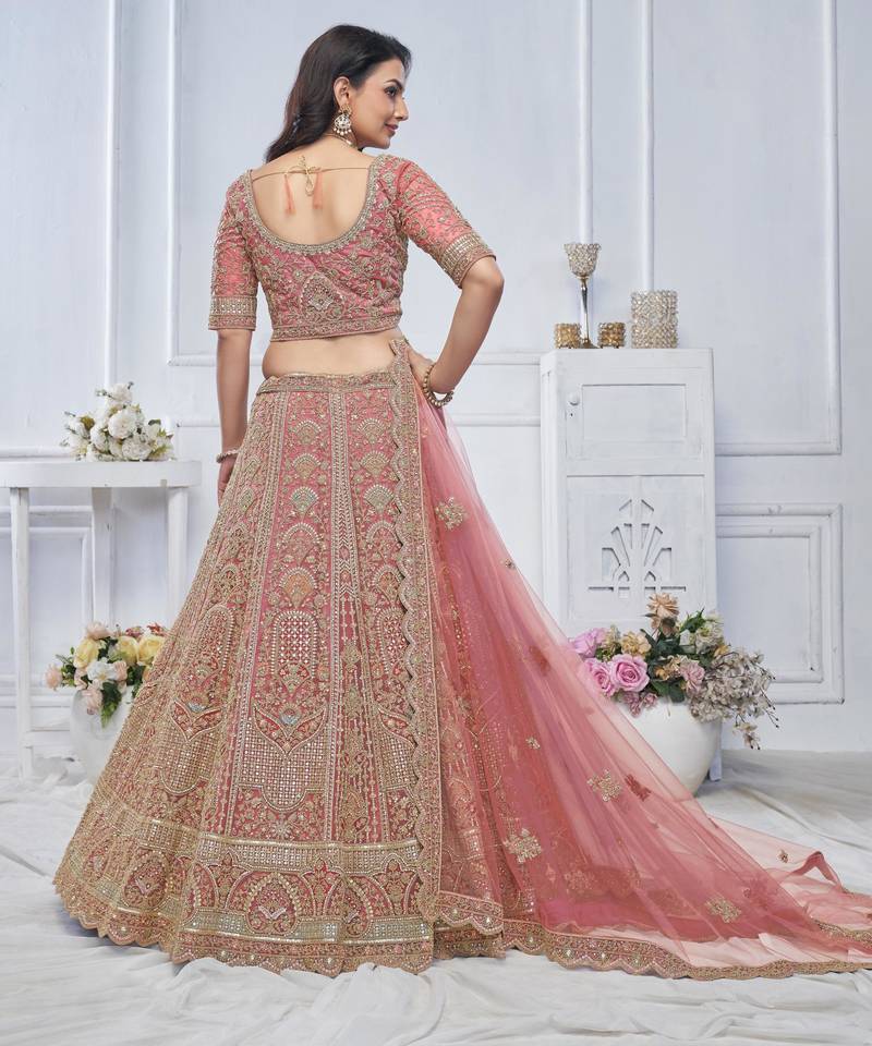 Onion pink embroidered net lehenga choli with dupatta