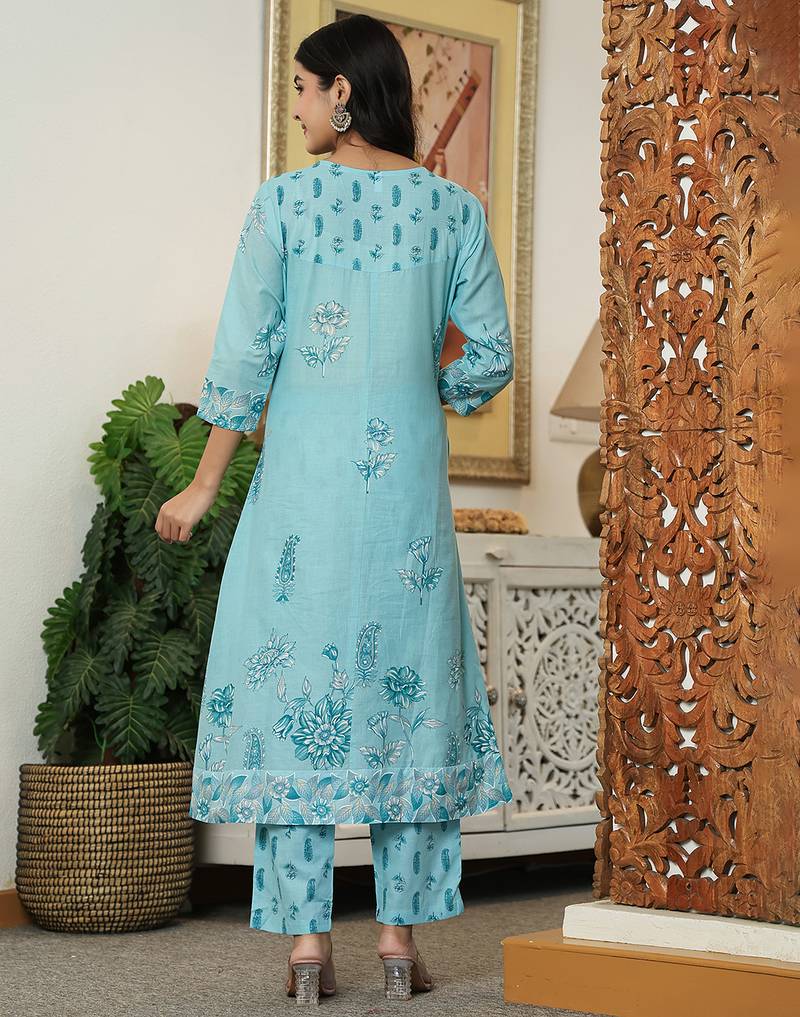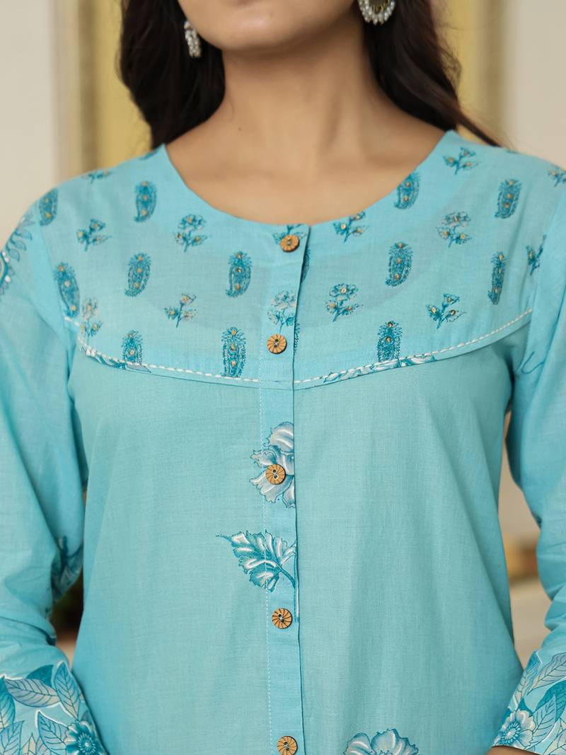 Product Name | Yufta Sky Blue Floral Print Pure Cotton Kantha Work A Line Kurta Trouser Dupatta Set | |
