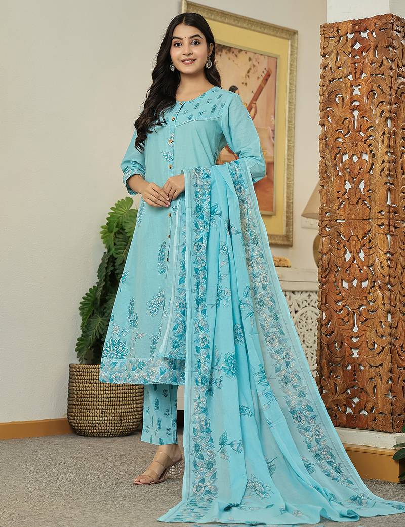 Product Description | Blue Pure Cotton Floral Print A Line Kurta Trouser Dupatta Set One Pocket Kurta Design Kantha Work,Sequins Work A Line Shape Front Slits Three Quarter Sleeve Sleeves Round Neck Calf Length Kurta Straight Him Machine Weave Pure Cotton Trouser Design: Green Pure Cotton Trouser Slip On Waist Size & Fit Material & Care Pure Cotton |