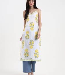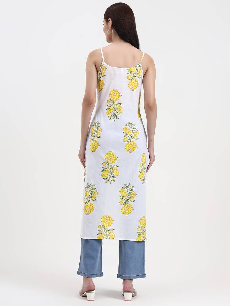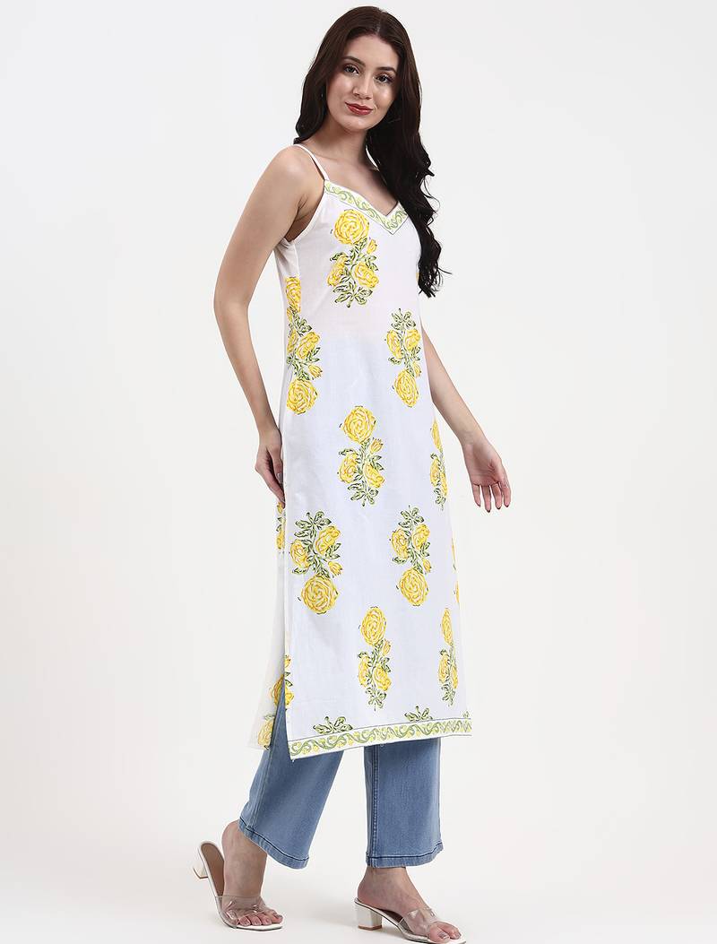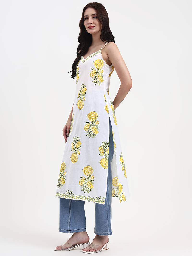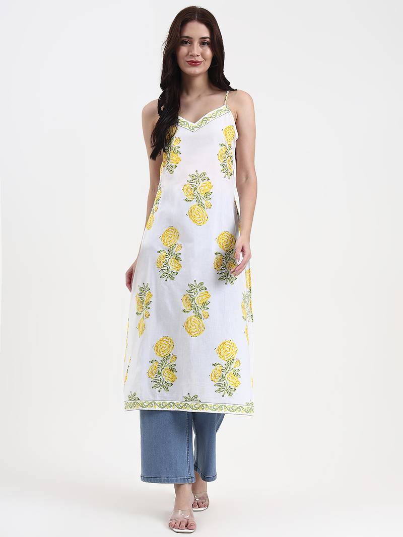 Product Description | White Floral Block Print Cotton Kurta Detailing ,Straight Shape V Neck Sleeveless Straight Hem, Side Slits Calf Lenth Size & Fit Material & Care Cotton Hand Wash |