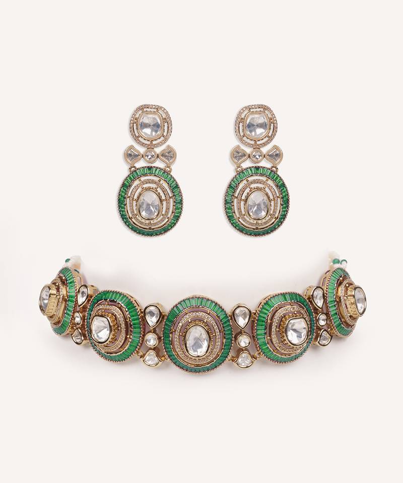 Product Description | A Regal Choker Adorned With Shining Moissanite Stones In Two Tone Finish. The Touch Of Green Stones Adds A Refreshing Contrast, Making It A Perfect Blend Of Heritage Charm And Timeless Grace.