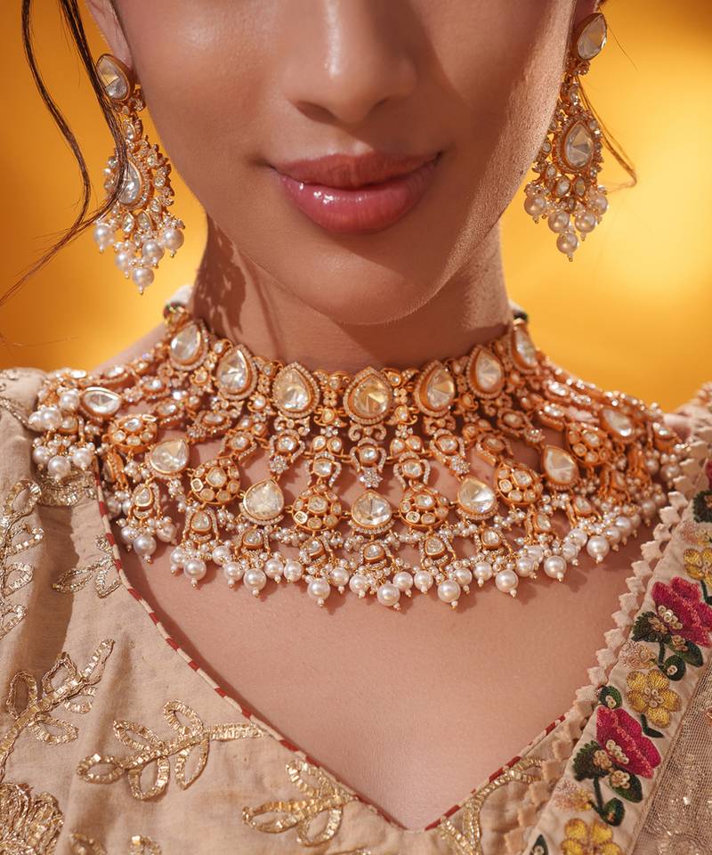 Product Description | A Masterpiece Of Refined Elegance, Featuring Brilliant Moissanite Stones And Pearl Drops Set In An Intricate, Regal Design. It Comes With A Pair Of Matching Earrings. Perfect For Grand Occasions, It Adds A Touch Of Timeless Sophistication To Any Ensemble.